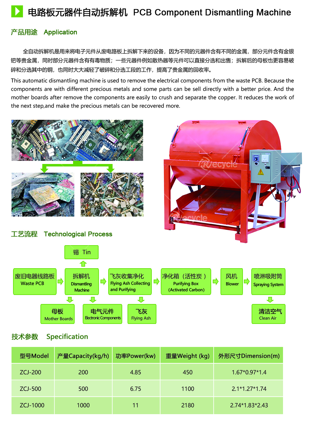 全自動拆解機是用來將電子元件從廢電路板上拆解下來的設備,因為不同的元器件含有不同的金屬,部分元件含有金銀鈀等貴金屬,同時部分元器件含有有毒物質;一些元器件例如散熱器等元件可以直接分選和出售;拆解后的母板也更容易破碎和分選其中的銅,也同時大大減輕了破碎和分選工段的工作,提高了貴金屬的回收率。