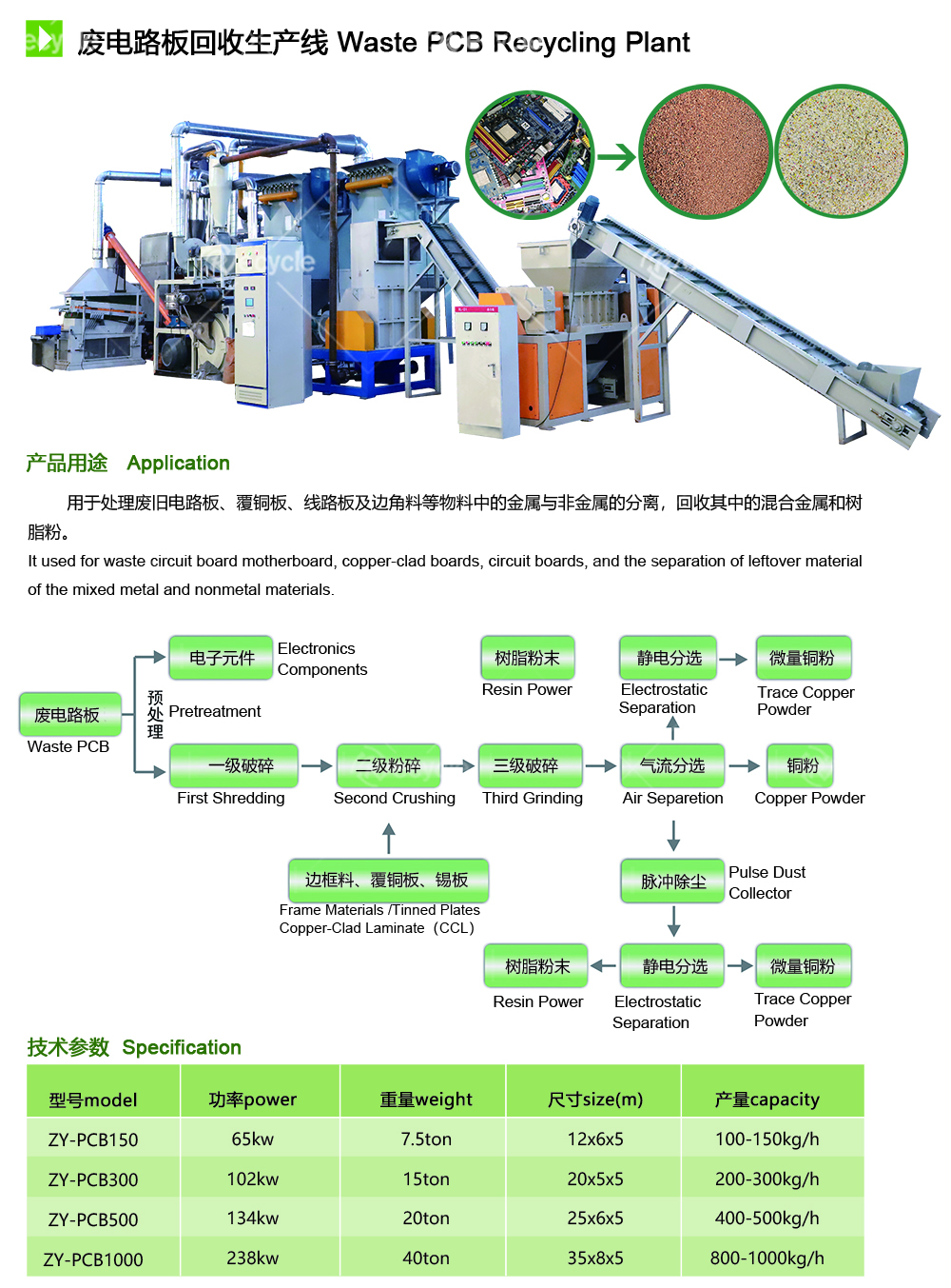 電(線)路板回收設(shè)備簡介:?廢舊電路板破碎回收生產(chǎn)線主要用于對廢舊家電板,電路板、覆銅板、線路板及邊角料等物料中的金屬與非金屬的分離,錫與元器件各自分離,該機的開發(fā)成功不但提高了回收銅的質(zhì)量,又防止二次污染。