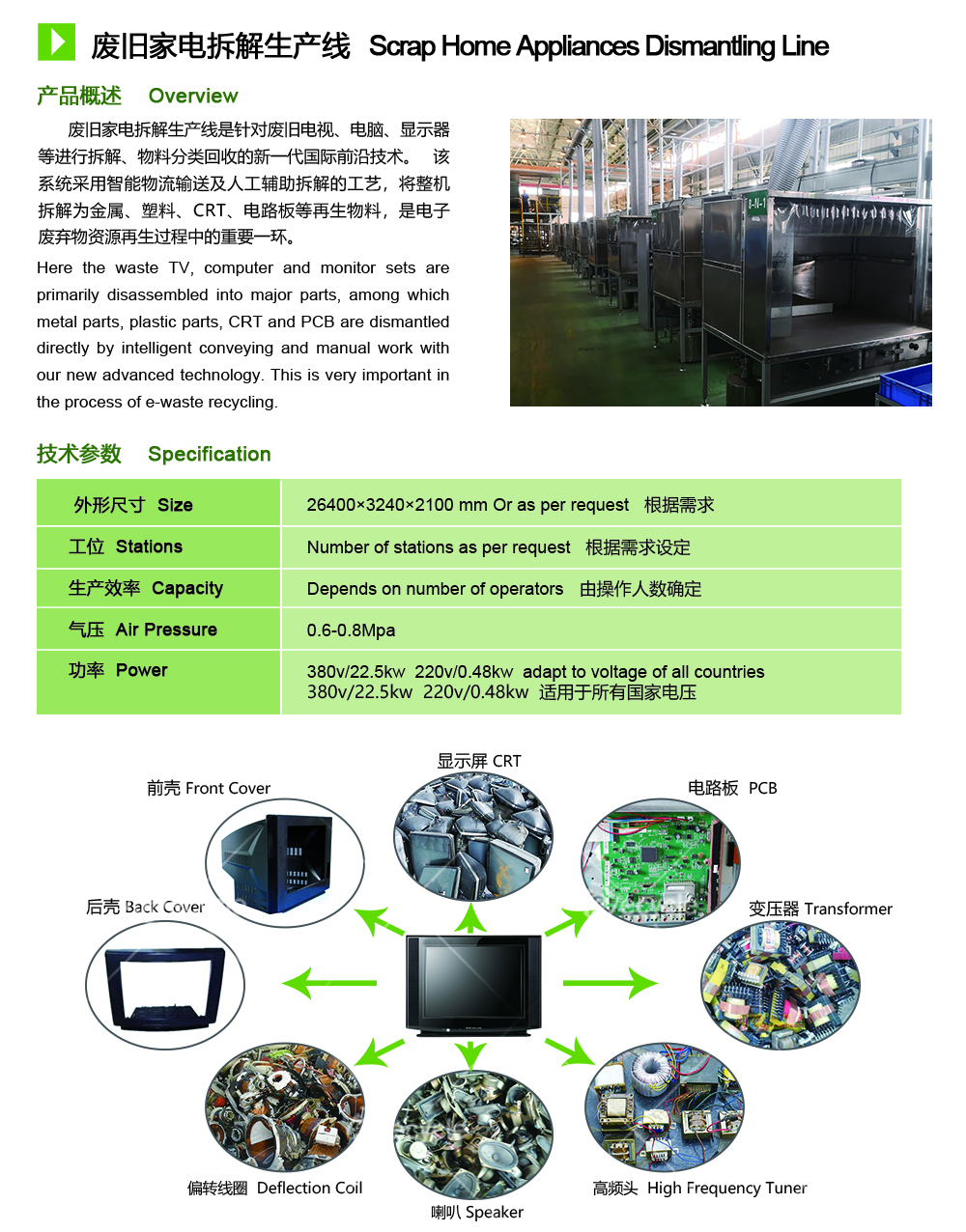 提供廢舊家電拆解機(jī)械并提供成套解決方案.廢舊家電拆解設(shè)備具有如下特點(diǎn)及優(yōu)勢(shì): 1.采用人工輔助拆解和機(jī)械粉碎分離相結(jié)合的工藝,具有資源分離效果好,設(shè)備處理效率高、設(shè)備價(jià)格低、處理功耗低、安全環(huán)保性能好等特點(diǎn),更加適合現(xiàn)階段行情。