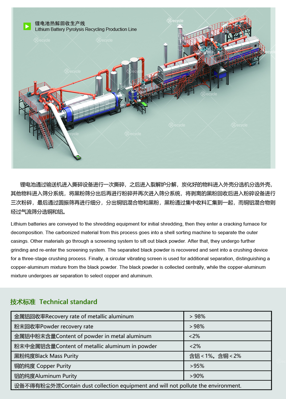 裂解爐,用于對廢舊鋰電池原料進行高溫裂解,具有效率高,安全可靠、環(huán)保節(jié)能等特點。經(jīng)過本熱解法鋰電池處理設備設備的處理,廢舊鋰電池中的電解液、塑料隔膜及PVDF等雜質(zhì)被有效去除。連續(xù)化熱解綜合回收一體化設備、極片物理回收創(chuàng)新技術及裝備、電池產(chǎn)業(yè)廢物熱解處理設備等的出現(xiàn),為廢舊鋰電池的回收利用提供了多種技術選擇。