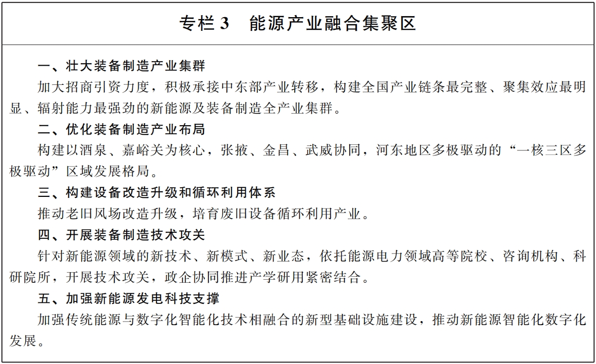 (十二)優(yōu)化裝備制造產(chǎn)業(yè)布局。堅(jiān)持全省一盤棋,明確各地新能源裝備制造產(chǎn)業(yè)發(fā)展重點(diǎn),形成錯(cuò)位發(fā)展、各具特色的產(chǎn)業(yè)格局。以酒泉、嘉峪關(guān)為核心,打造中國(guó)西部鏈條最完整、聚集效應(yīng)最明顯、產(chǎn)能規(guī)模最大的風(fēng)電、光伏、光熱裝備制造業(yè)基地;以酒泉、張掖、金昌、武威為重點(diǎn),圍繞綠氫生產(chǎn)及綜合利用、儲(chǔ)能裝備制造、智能運(yùn)維等領(lǐng)域延鏈補(bǔ)鏈;在蘭州、白銀、定西、天水等地區(qū),以既有產(chǎn)業(yè)為依托,加快新能源裝備制造產(chǎn)業(yè)布局,培育新能源輕型核心技術(shù)產(chǎn)業(yè),形成全省新能源產(chǎn)業(yè)發(fā)展新增長(zhǎng)極。(責(zé)任單位:省能源局、省發(fā)展改革委、省工信廳)