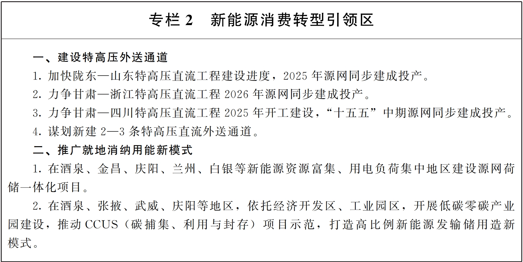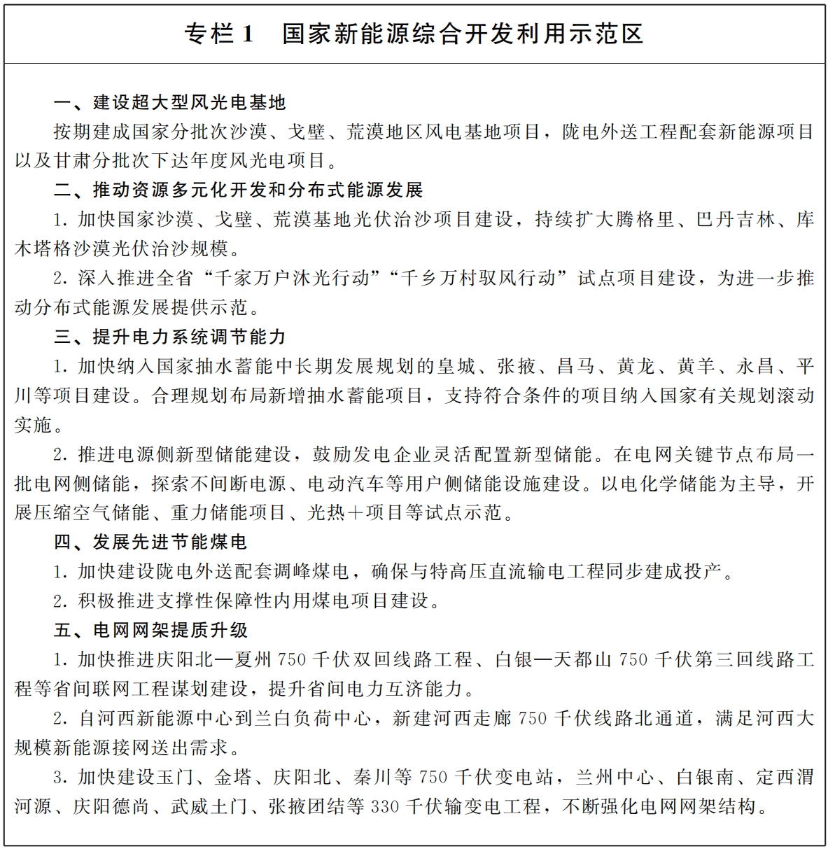(六)建設(shè)特高壓外送通道。堅(jiān)持大型基地、支撐煤電、特高壓通道協(xié)同發(fā)展,加快推動(dòng)隴電入魯、隴電入浙、隴電入川工程規(guī)劃建設(shè),推廣柔性直流輸電先進(jìn)技術(shù)。謀劃建設(shè)庫木塔格沙漠、騰格里沙漠二回、巴丹吉林沙漠二回等外送輸電通道。試點(diǎn)開展新型交直流輸電技術(shù)應(yīng)用。(責(zé)任單位:省能源局、國(guó)網(wǎng)甘肅省電力公司)