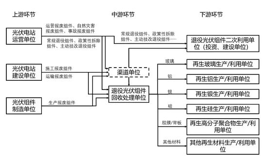 游)、退役組件回收處理單位 (中游)、退役組件再利用及原材料再生產(chǎn)、再利用單位 (下游) 構(gòu)成。其中,上游環(huán)節(jié)主要包括電站業(yè)主單位、電站建設(shè)單位及組件制造單