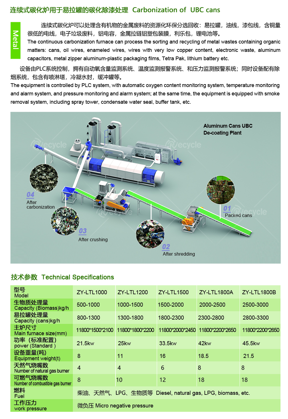 易拉罐脫漆設(shè)備?利用高溫采用簡(jiǎn)介加熱方式,使漆膜中的有機(jī)物質(zhì)蒸發(fā)和分解,從而實(shí)現(xiàn)漆膜脫落,加熱區(qū)溫度和加熱時(shí)間也根據(jù)不同的漆膜種類和易拉罐要求進(jìn)行控制,自動(dòng)化強(qiáng)。連續(xù)式炭化爐設(shè)備,可炭化處理易拉罐、金屬?gòu)U料、漆包線、鋰電池以及生物質(zhì)廢料等等,既解決了普通炭化過程中產(chǎn)生的煙氣污染問題